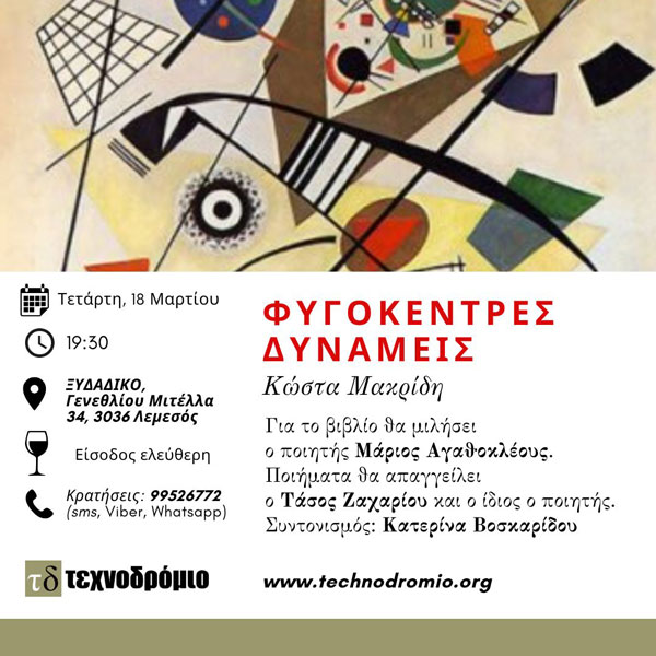 Το Κέντρο Λόγου και Τεχνών Τεχνοδρόμιο παρουσιάζει την ποιητική συλλογή του Κώστα Μακρίδη «Φυγόκεντρες Δυνάμεις» (εκδόσεις Τεχνοδρόμιον, 2025), την Τετάρτη, 18 Μαρτίου, η ώρα 7:30 μ.μ. στο Ξυδάδικο, Γενεθλίου Μιτέλλα 34, στη Λεμεσός.