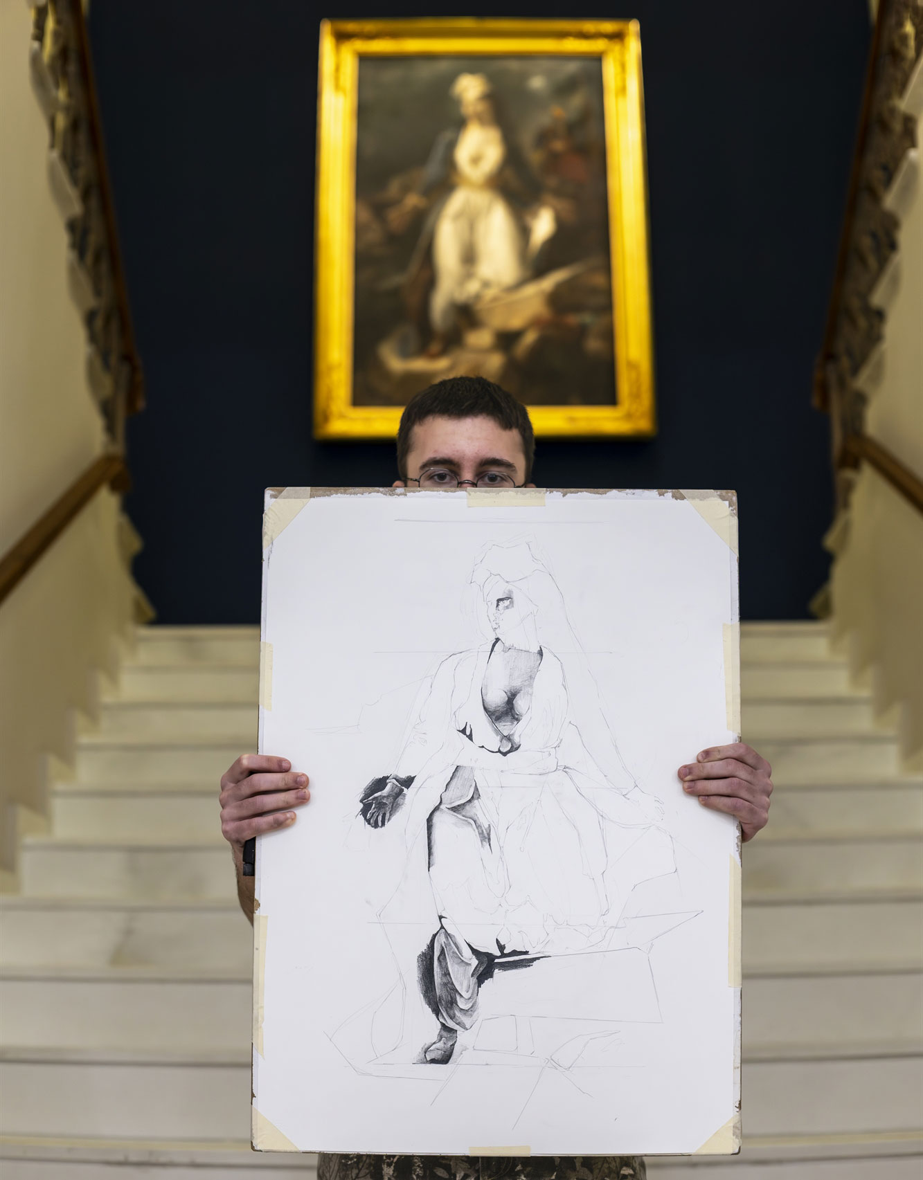 Ο μαθητής Γιώργος Κρανιώτης κρατάει ένα αντίγραφο της «Ελλάδας» του Ντελακρουά, που ο ίδιος ξεκίνησε να σχεδιάζει με μολύβι. «Το πιο δύσκολο», λέει, «είναι να αποτυπωθεί το βλέμμα της γυναίκας». [ΝΙΚΟΣ ΑΛΙΑΓΑΣ]