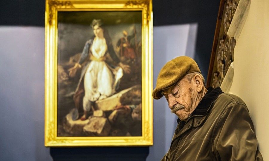 Μπροστά της στέκονται με συγκίνηση και οι μεγαλύτερες γενιές. Οπως ο 93χρονος Σπύρος Ζαχαράτος, απόγονος των ηρώων του Μεσολογγίου. Θυμάται τις αφηγήσεις των γονιών του για την προγιαγιά του, που μετά τον «μεγάλο χαλασμό» είχε φτάσει μέχρι την Κωνσταντινούπολη για να βρει τη χαμένη κόρη της. Θυμάται τις παρελάσεις στις οποίες συμμετέχει –θα παρελάσει και φέτος– και θυμάται επίσης όλους τους πίνακες για την Εξοδο, μαζί και την ιστορία τους. Είδε εκείνον του Ντελακρουά πριν από την «πρεμιέρα» του, μια ημέρα που περνούσε μπροστά από το Ξενοκράτειο και κάποιος τον φώναξε μέσα: «Εκείνη την ώρα ετοιμάζονταν να τον σηκώσουν, να τον τοποθετήσουν», λέει ο κ. Σπύρος. «Αισθάνθηκα ένα δέος, μια μεγάλη συγκίνηση μόλις τον είδα. Βούρκωσαν τα μάτια μου όταν αντίκρισα αυτό το ωραίο πράγμα».