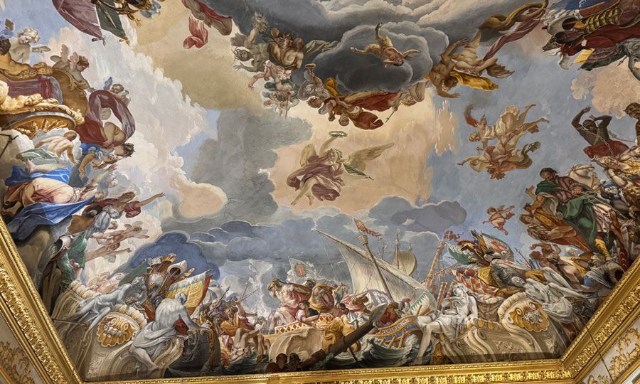 Σε οροφές των αιθουσών, οι Φιλίππο Γκερνάρντι, Τζοβάννι Κόλι, Σεμπαστιάνο Ρίτσι, Τζουζέπε Μπαρτολομέο Κιάρι κ.α. έχουν φιλοτεχνήσει εντυπωσιακές νωπογραφίες. Ο ναύαρχος του παπικού στόλου Μαρκαντώνιο Β΄ Κολόνα απεικονίζεται πολλές φορές στο θόλο της Μεγάλης Αίθουσας, της Πινακοθήκης, της Αίθουσας της Μάχης και στην Αίθουσα των Τοπίων.