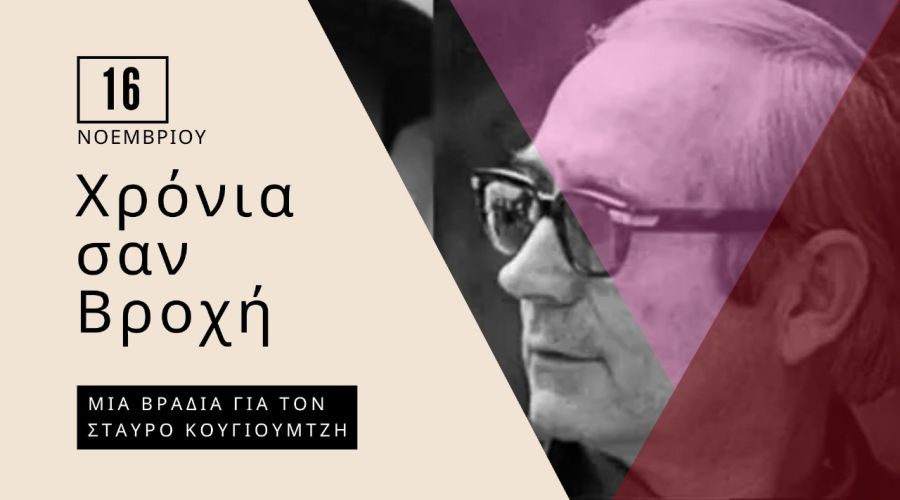 Η εκδήλωση «Χρόνια σαν βροχή» αφιερωμένη στον Σταύρο Κουγιουμτζή την Κυριακή 16 Νοεμβρίου είναι μία επίσκεψη στον κόσμο του σπουδαίου μουσικοσυνθέτη, του οποίου η απλότητα και η ειλικρίνεια, ο λυρισμός και ο σπαραγμός όπως εκφράστηκαν τόσο μέσα από τα πολλά γνωστά του τραγούδια, όσο και μέσα από τα πεζά του κείμενα, σφράγισαν για πάντα το ελληνικό τραγούδι και τον ελληνικό πολιτισμό.