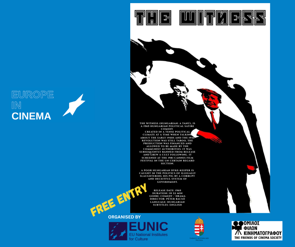 Η ταινία The Witness είναι μια πολιτική σατιρική κωμωδία που δημιουργήθηκε σε μια περίοδο έντονης πολιτικής φόρτισης, όταν η δημόσια αναφορά στις αρχές της δεκαετίας του 1950 και στην Ουγγρική Επανάσταση του 1956 παρέμενε ταμπού. Παρότι η παραγωγή της χρηματοδοτήθηκε και εγκρίθηκε από τις κομμουνιστικές αρχές, απαγορεύτηκε στη συνέχεια και αργότερα απέκτησε καλτ χαρακτήρα. Η προβολή θα γίνει στα ουγγρικά με αγγλικούς υπότιτλους.