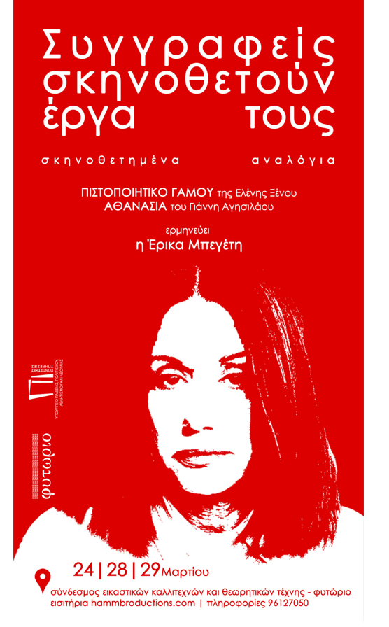 Οι συγγραφείς Γιάννης Αγησιλάου και Ελένη Ξένου δοκιμάζουν για πρώτη φόρα να δουλέψουν με έργα τους, παρουσιάζοντάς τα υπό την μορφή σκηνοθετημένου αναλογίου. Ερμηνεύει η καταξιωμένη ηθοποιός Έρικα Μπεγέτη.