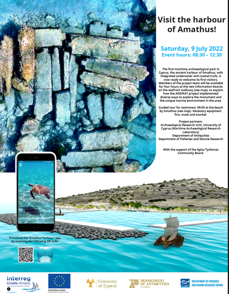 Το έργο υλοποιήθηκε από το Εργαστήριο Εναλίων Αρχαιολογικών Ερευνών (ΕΡΕΝΑΕ) της Ερευνητικής Μονάδας Αρχαιολογίας του Πανεπιστημίου Κύπρου, το Τμήμα Αρχαιοτήτων του Υπουργείου Μεταφορών, Επικοινωνιών και Έργων και το Τμήμα Αλιείας και Θαλασσίων Ερευνών του Υπουργείου Γεωργίας, Φυσικών Πόρων και Περιβάλλοντος, στο πλαίσιο της Πράξης ΑνΔιΚαΤ «Ανάπτυξη Δικτύου Καταδυτικού Τουρισμού», του Προγράμματος Διασυνοριακής Ελλάδα – Κύπρος, 2014 – 2020, INTERREG V – A. Το πρόγραμμα έλαβε συγχρηματοδότηση από την Ευρωπαϊκή Ένωση (ΕΤΠΑ) και από Εθνικούς Πόρους της Ελλάδας και της Κύπρου. Στόχος του έργου είναι η ανάδειξη του αρχαίου λιμανιού της Αμαθούντας και η προβολή της υποβρύχιας πολιτιστικής και φυσικής κληρονομιάς, μέσω της δημιουργίας κολυμβητικών και περιπατητικών διαδρομών.