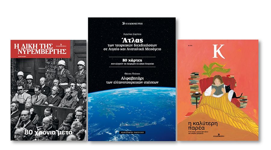 Ακούμε εδώ και χρόνια για τα χωρικά μας ύδατα, την υφαλοκρηπίδα και την ΑΟΖ. Ξέρουμε τι ακριβώς είναι όλα αυτά και ποια είναι τα εθνικά διακυβεύματα σε σχέση με τις διεκδικήσεις των Τούρκων; Η ειδική έκδοση «Άτλας των τουρκικών διεκδικήσεων σε Αιγαίο και Ανατολική Μεσόγειο», που προσφέρει η Καθημερινή αυτή την Κυριακή 4 Ιανουαρίου, λύνει πολλές απορίες. Μαζί, η ειδική έκδοση «Η Δίκη της Νυρεμβέργης» που ρίχνει φως στη δίκη των πρωτοπαλίκαρων του Χίτλερ και το περιοδικό Κ που είναι αφιερωμένο στα βιβλία.